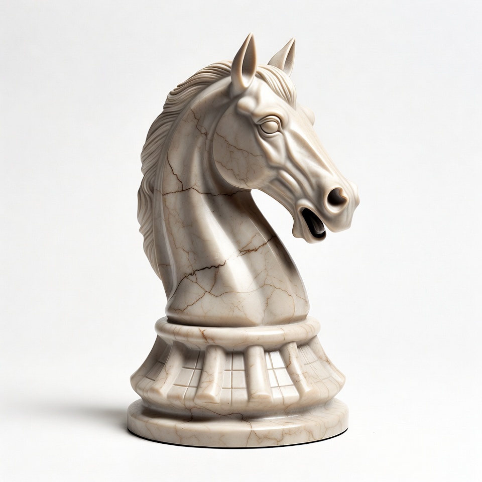 A detailed marble statue of a horse's head showcases elegant craftsmanship and design, sitting prominently on a pedestal.