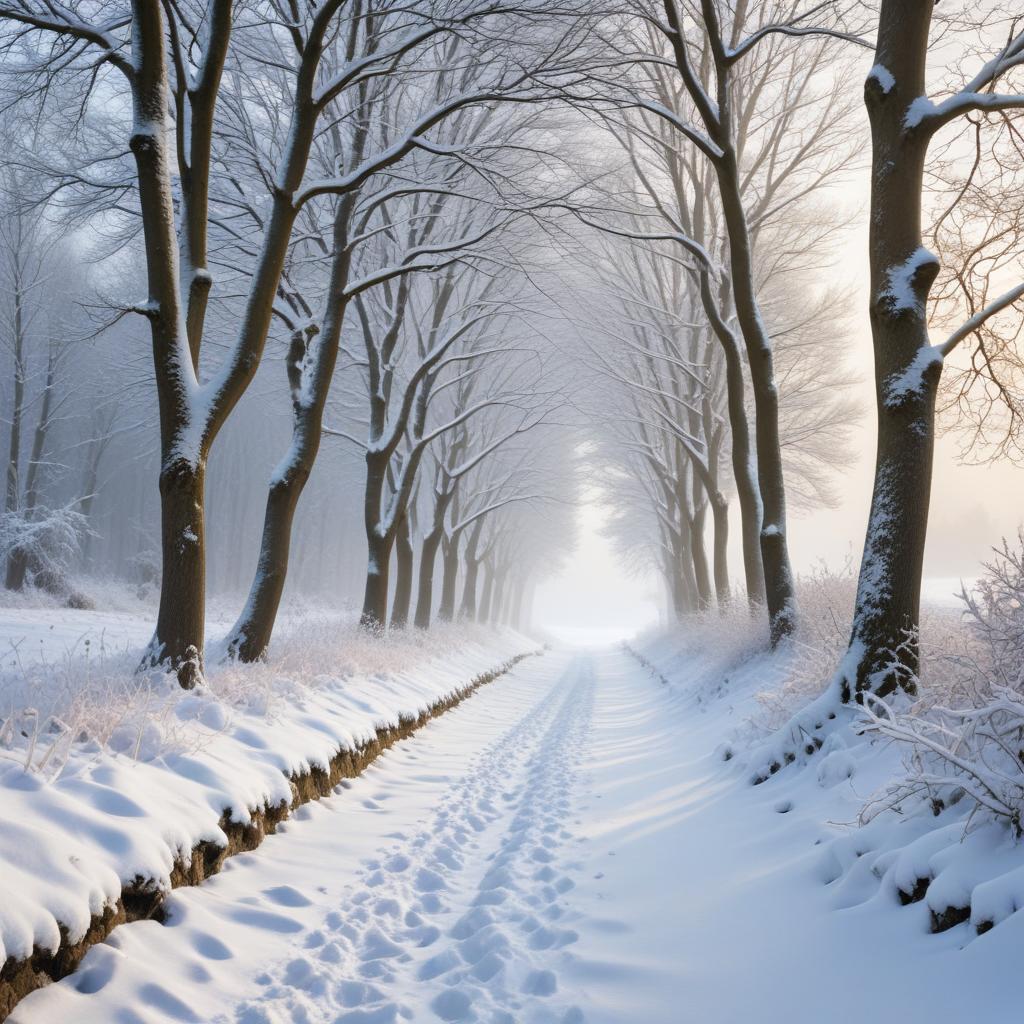 A tranquil winter pathway lined with bare trees is covered in fresh snow, leading towards a bright, foggy distance. The scene is peaceful and serene.