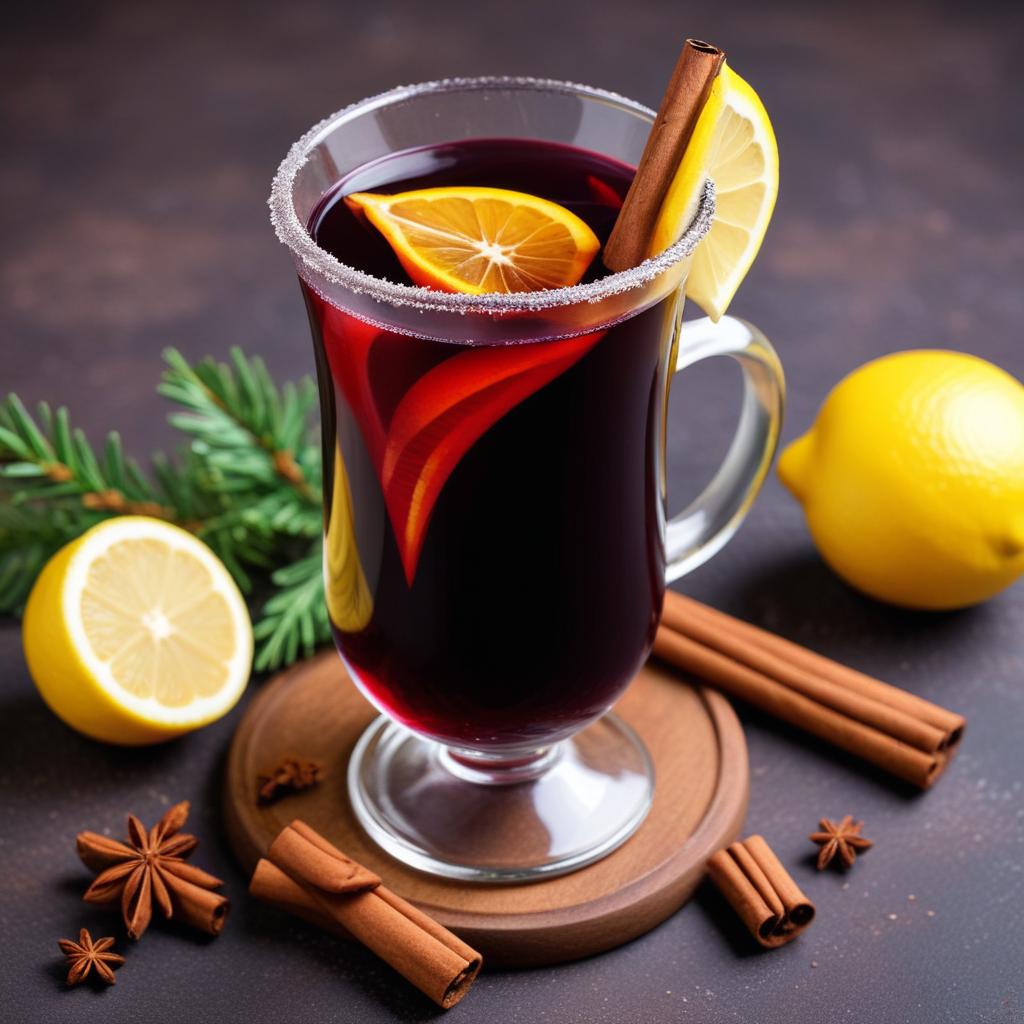 A warm spiced drink is garnished with a cinnamon stick and citrus slices on a wooden coaster, surrounded by lemon and aromatic spices.