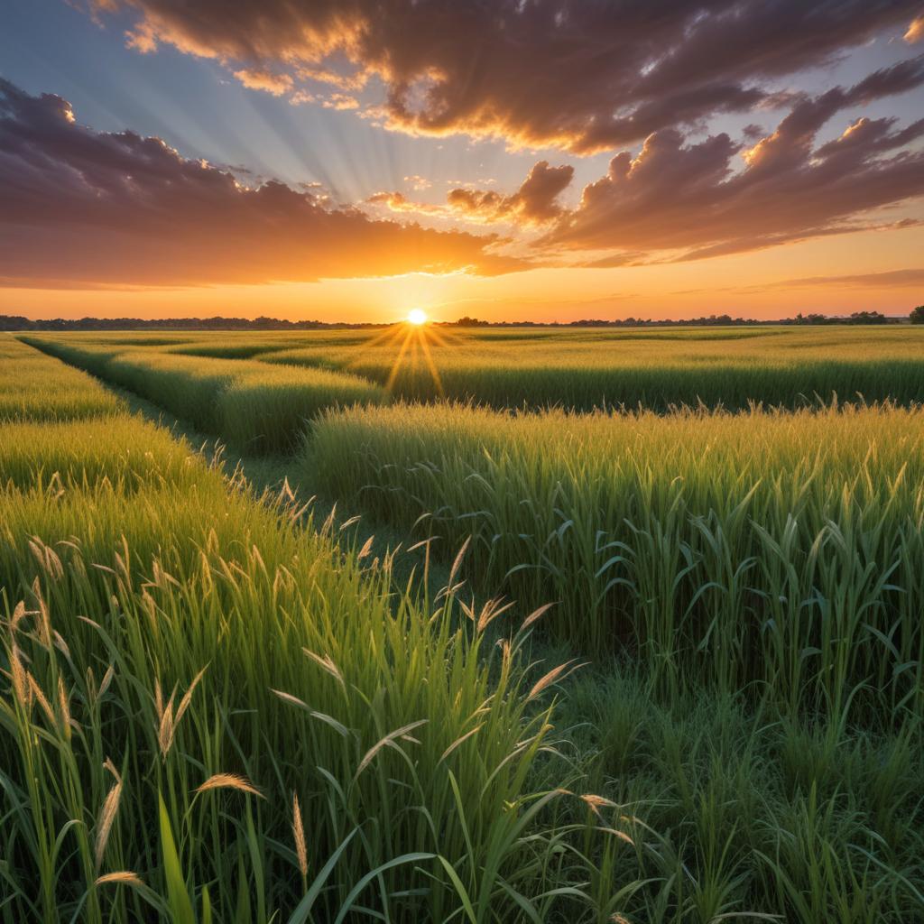agriculture, clouds, evening, farming, golden hour, greenery, growth, horizon, natural beauty, nature, outdoors, plants, rice fields, rural, scenic, serene landscape, sky, sunlight, sunset, tranquility