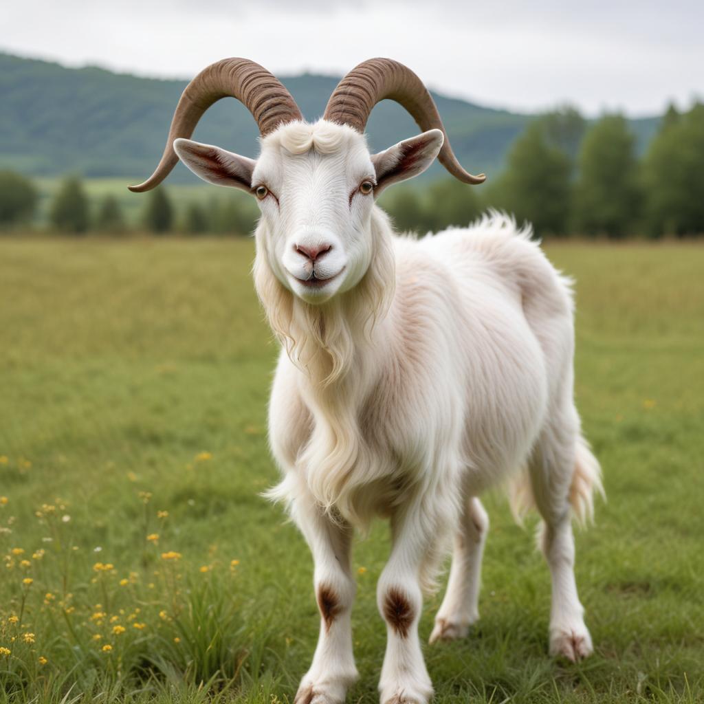 A friendly white goat with curved horns stands in a lush green field, surrounded by flowers. Trees and hills are visible in the background.