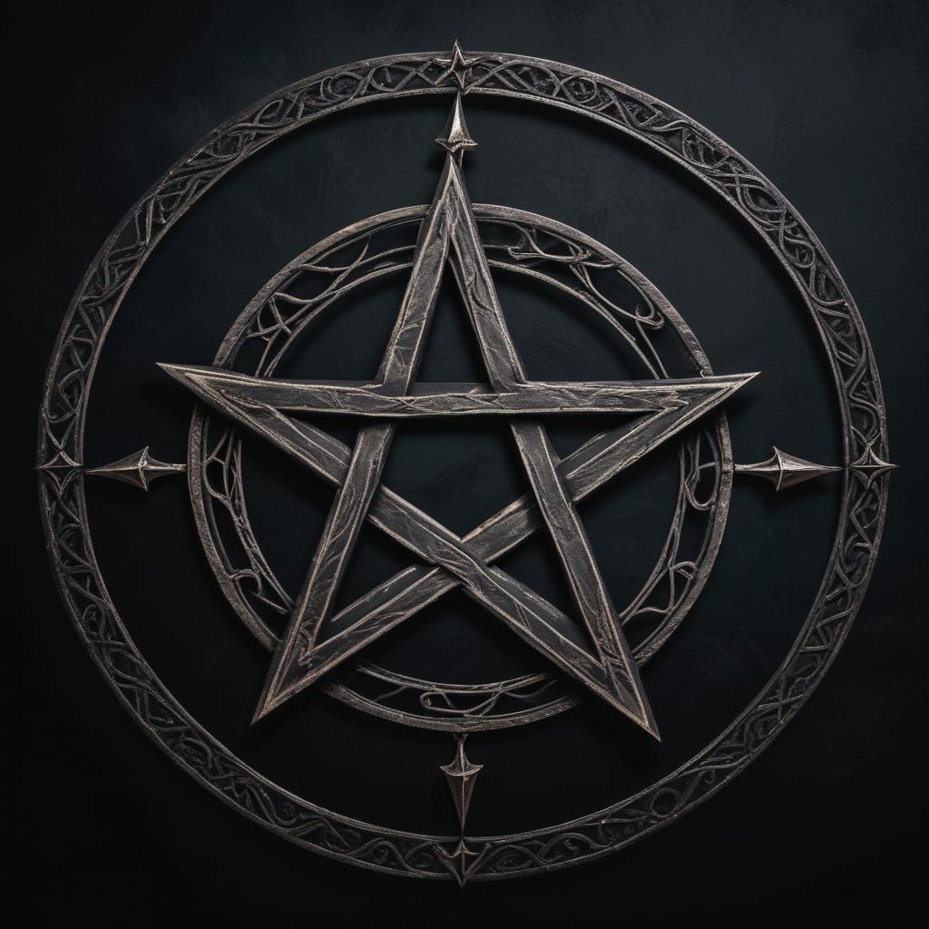 A detailed five-pointed star sits inside a circular design against a dark backdrop, showcasing intricate patterns that enhance its mystique.