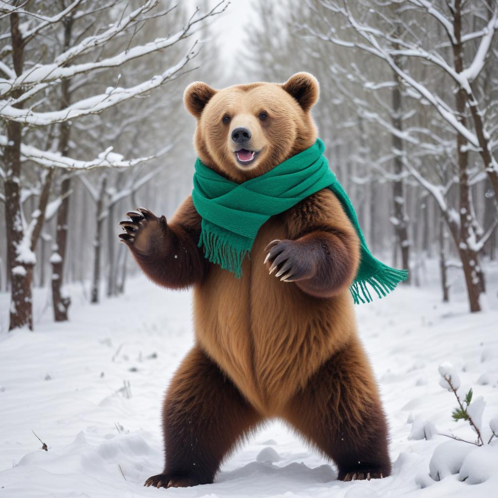 A large bear wearing a green scarf stands in a snowy forest, surrounded by tall trees. Snow blankets the ground in this winter scene.