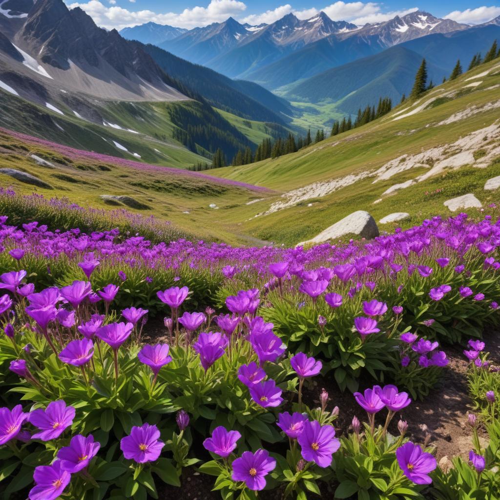 A stunning valley filled with blooming purple wildflowers surrounded by majestic mountains under a clear blue sky in springtime.