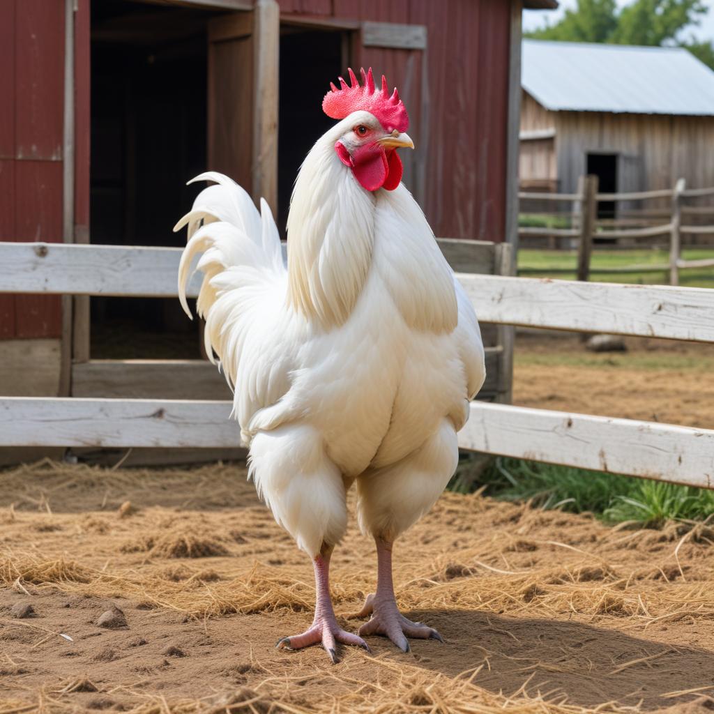 A large white rooster stands proudly in a farmyard. It is surrounded by wooden fences and an old barn, enjoying the sunny day.