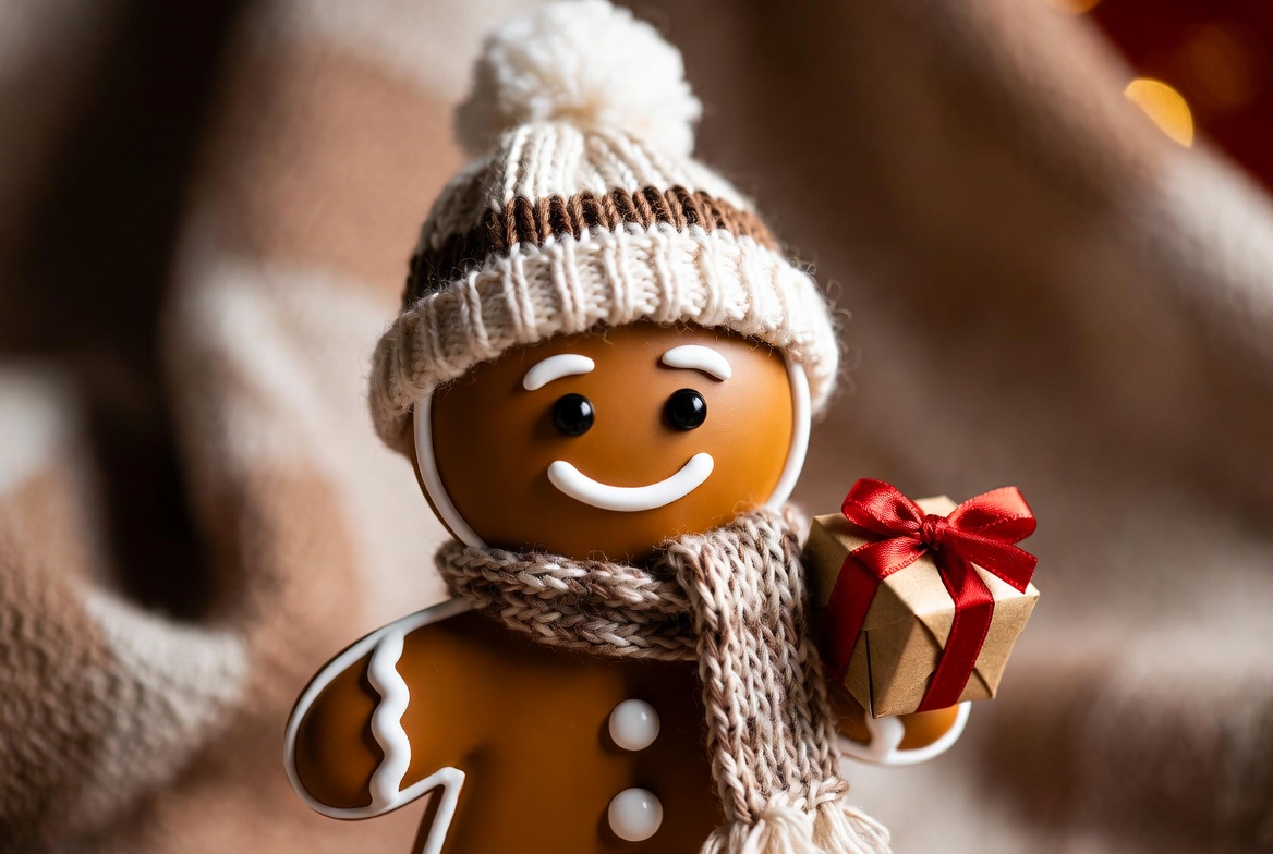 A cheerful gingerbread figure wearing a cozy hat and scarf holds a small wrapped gift, surrounded by soft holiday decorations.