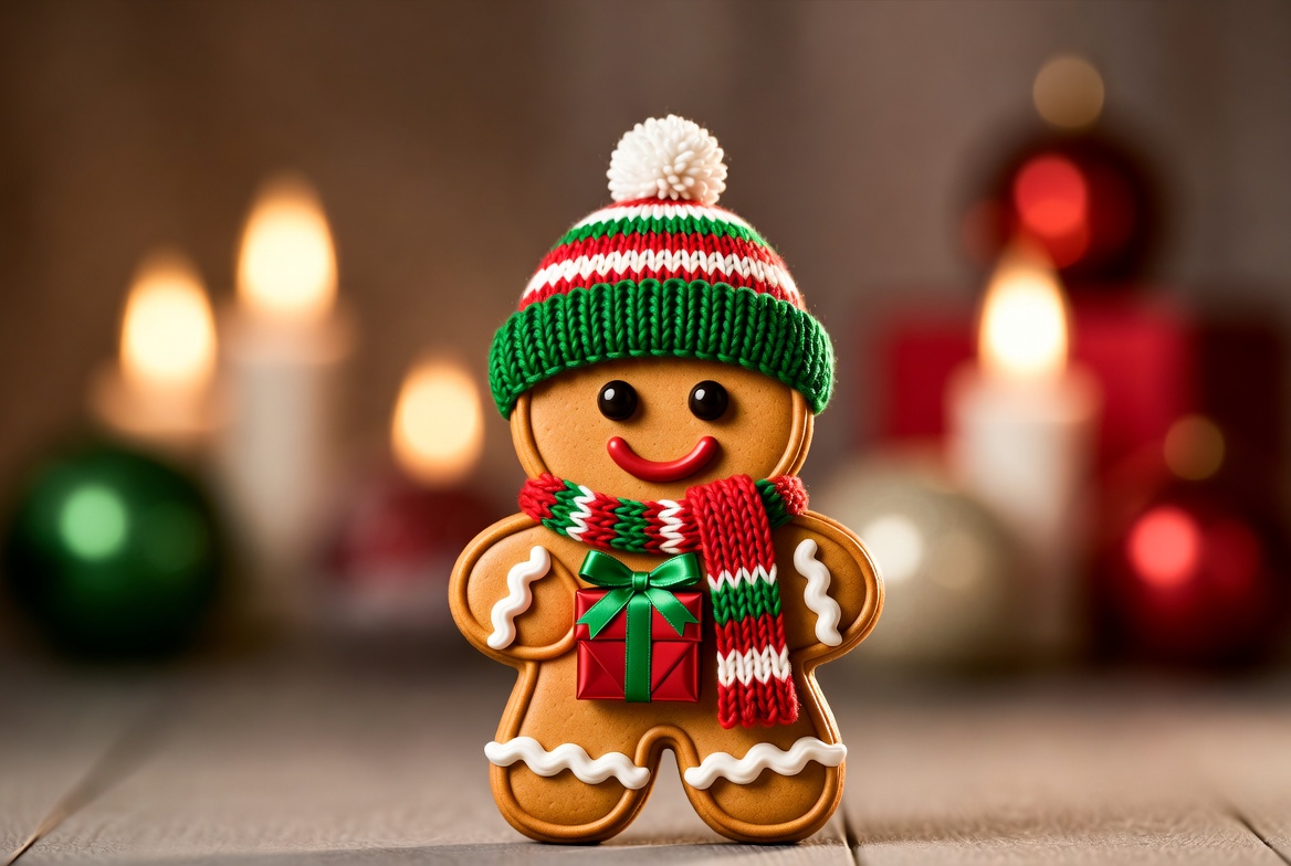 A festive gingerbread cookie stands proudly wearing a striped hat and scarf, holding a small gift, surrounded by soft candlelight and ornaments.