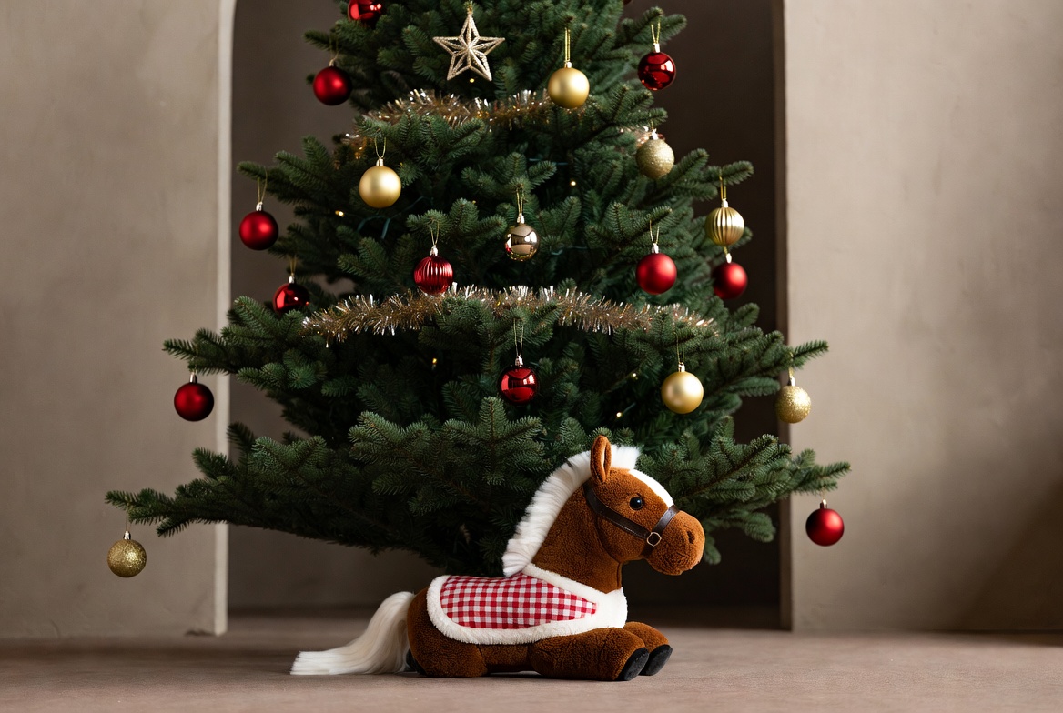 A beautifully decorated Christmas tree stands tall with ornaments and a plush horse nearby, creating a warm festive atmosphere in the room.