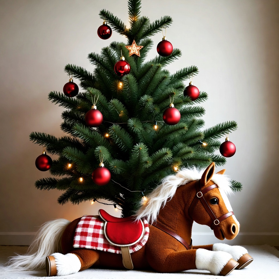 A beautifully decorated Christmas tree stands tall with red ornaments. A plush toy horse rests underneath, adding a charming touch to the scene.