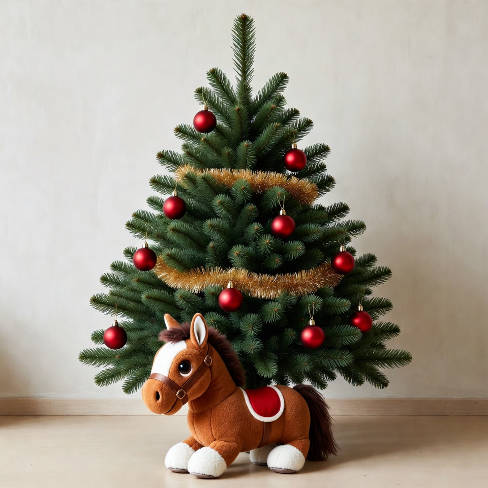 celebration, celebration spirit, christmas, cozy, decoration, family, festive, greenery, holiday, horse, indoor, joy, ornaments, pine, plush, red, seasonal, toys, tree, winter
