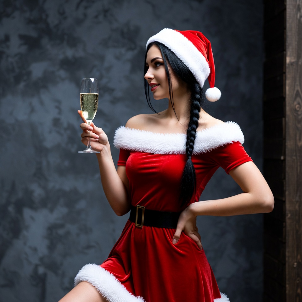 A woman in a red Santa outfit holds a champagne glass. She poses confidently against a gray backdrop, celebrating the holiday season.