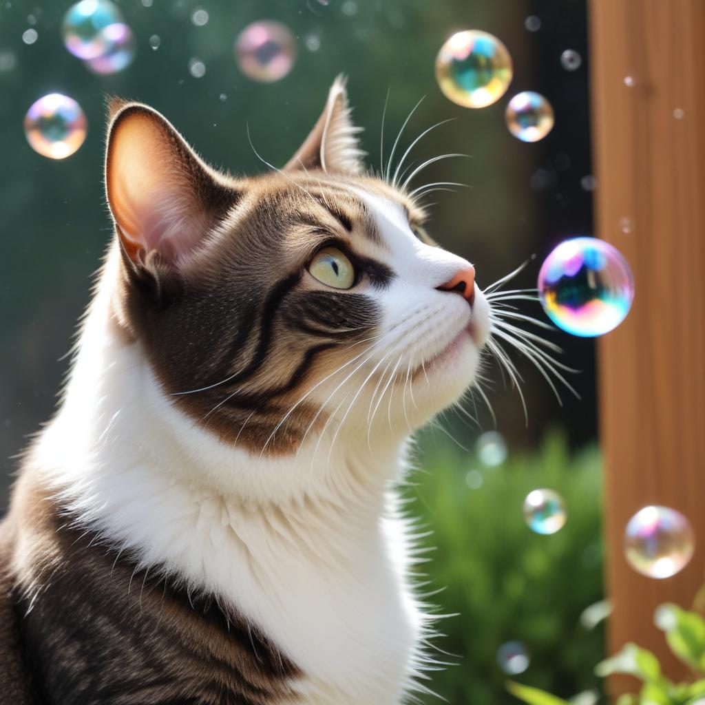 activity, atmosphere, bubbles, cat, close-up, curious, domestic, eyes, feline, floating, garden, green, joyful, nature, outdoor, pet, playful, sunlight, visual, whiskers