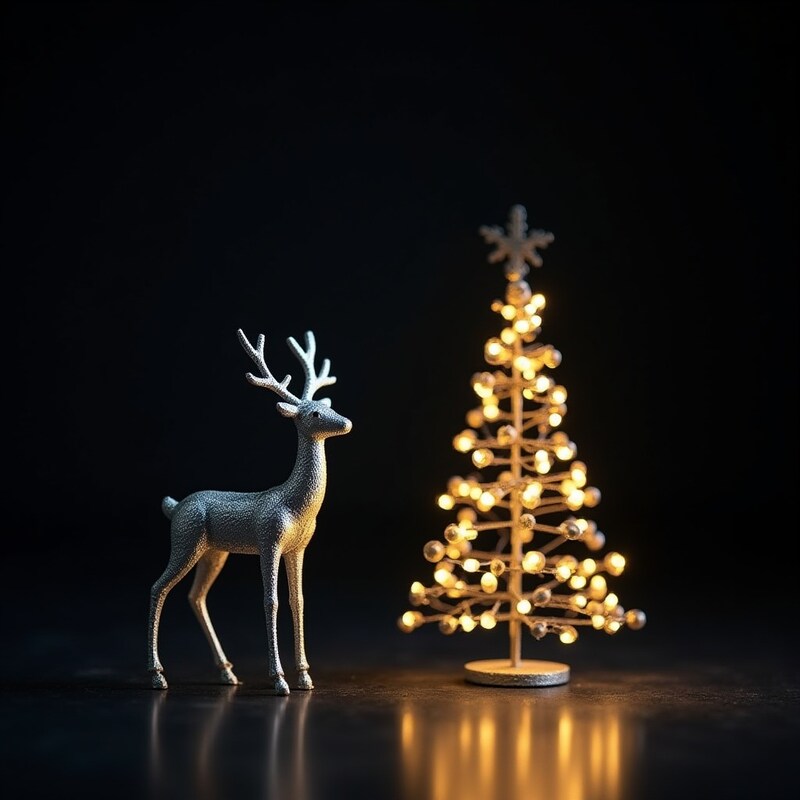 A silver reindeer stands beside a brightly lit Christmas tree. The scene captures a cozy, holiday ambiance with glowing lights.