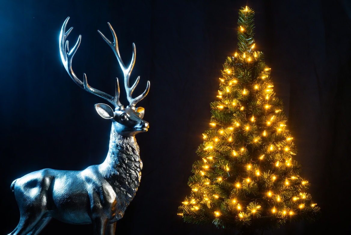 animal, beautiful, bright, celebration, christmas tree, decorations, family, festive, glowing, handmade, holiday, lights, nature, ornaments, party, reindeer, scene, shine, silver, winter