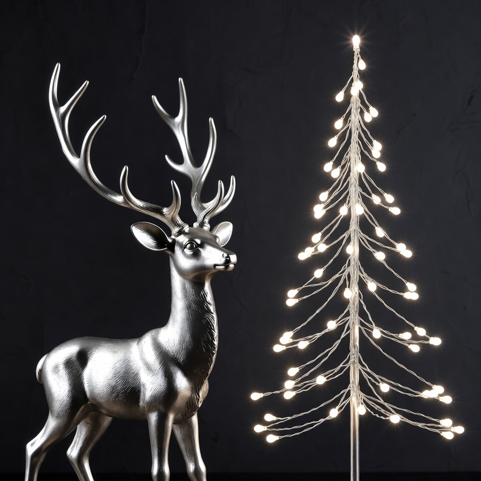 A silver reindeer stands next to a glowing lighted tree, creating a festive atmosphere. The scene is simple yet charming, ideal for holiday decor.