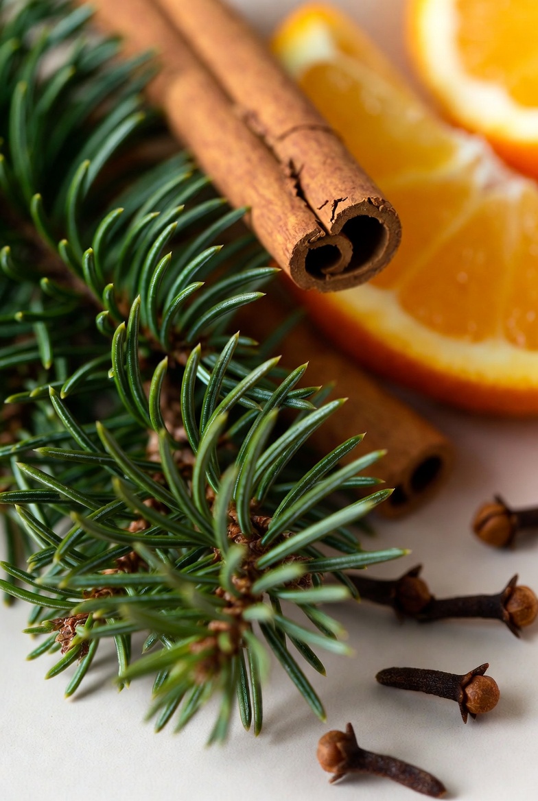 Fresh cinnamon sticks, cloves, and pine needles are beautifully arranged with orange slices, creating a warm seasonal display.