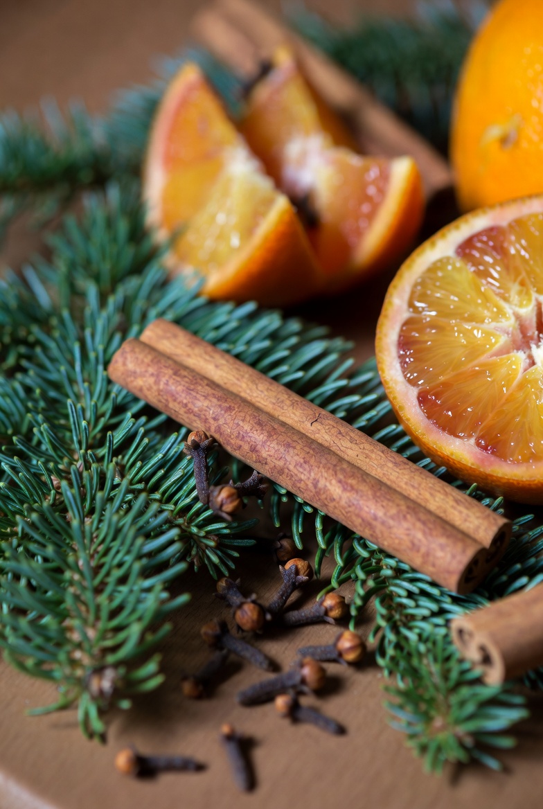 aroma, arrangement, cinnamon, cloves, decoration, festive, food, fragrance, fresh, holiday, ingredients, natural, orange slices, oranges, pine branches, seasonal, spices, tabletop, winter, wood