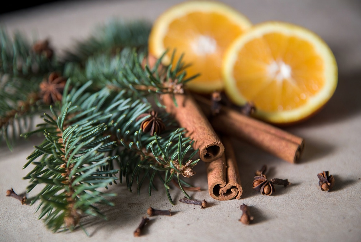 aroma, arrangement, baking, cinnamon, cooking, decor, earthy, festive, holiday, ingredients, natural, orange, orange slices, pine, pine branches, rustic, seasonal, spices, warmth, winter