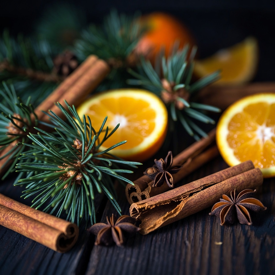 Christmas, aroma, arrangement, celebration, cinnamon, citrus, cozy, decor, evergreen, festive, flavor, holiday, ingredients, natural, orange, pine, scent, spices, warmth, winter