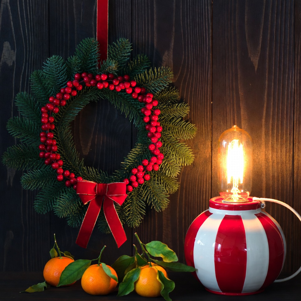 Christmas, berries, bright, celebration, cozy, decor, festive, garland, green, holiday, home, illumination, lamp, lights, oranges, red, rustic, seasonal, winter, wreath