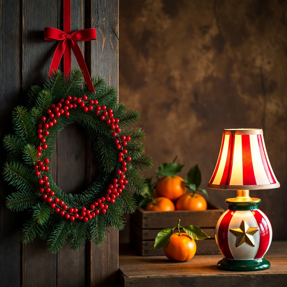 A festive wreath hangs beside a colorful lamp. Oranges are displayed in a wooden crate, adding warmth to the cheerful holiday scene.