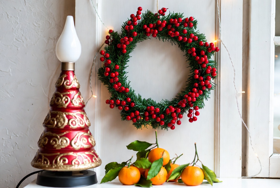 A festive wreath adorned with red berries hangs on a wall. Nearby sits a decorative lamp and fresh oranges, evoking a warm holiday atmosphere.