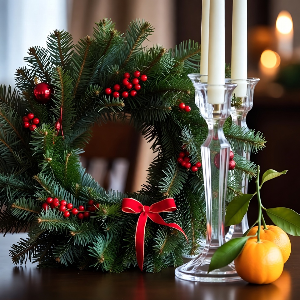 A festive wreath adorned with red berries and a bow sits next to elegant candle holders and fresh oranges, creating a warm atmosphere.