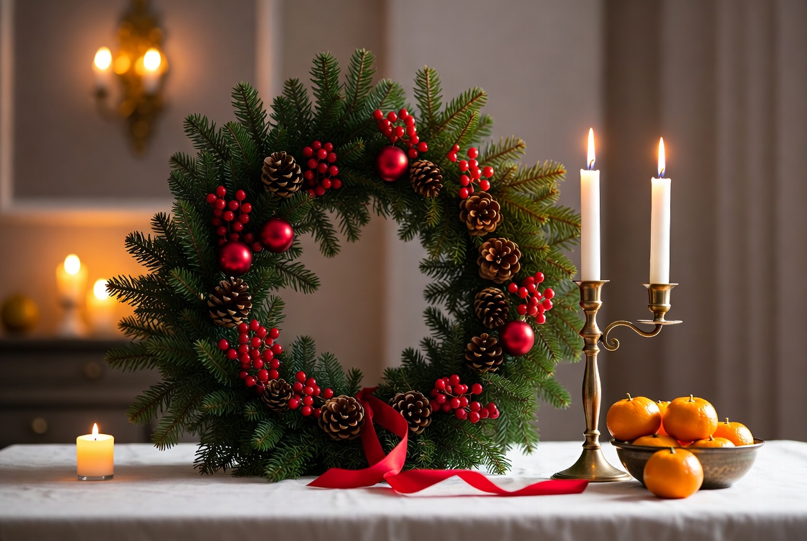 A beautifully decorated table features a Christmas wreath, candles, and oranges, creating a warm holiday atmosphere.