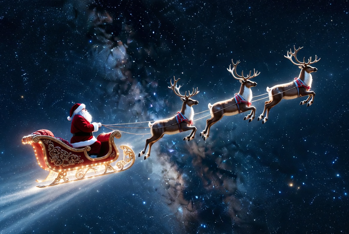 Santa is joyfully riding his sleigh pulled by three reindeer through a starry night sky. The galaxy sparkles in the background.