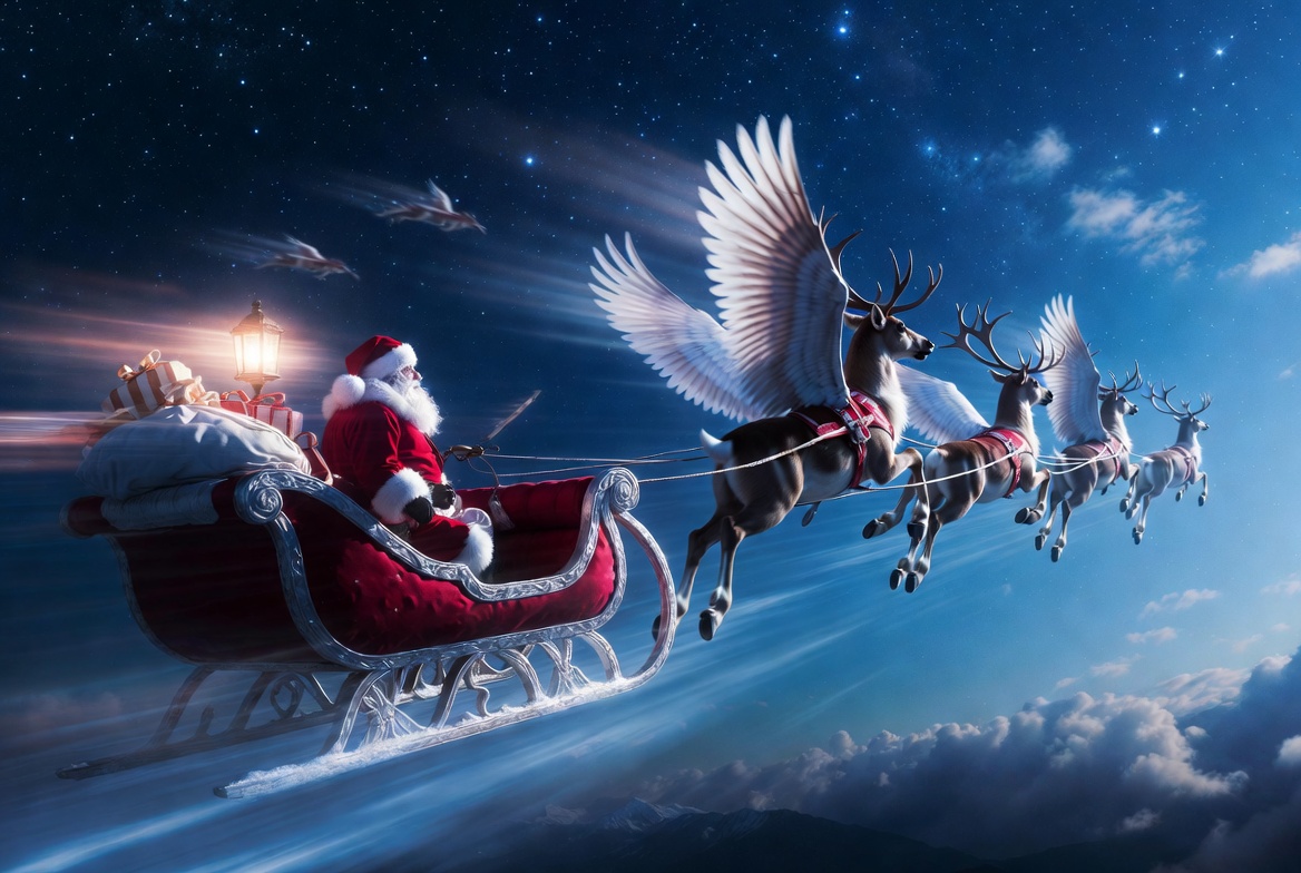 Santa Claus rides a sleigh pulled by flying reindeer through a starry night sky, passing above fluffy clouds with holiday presents in tow.