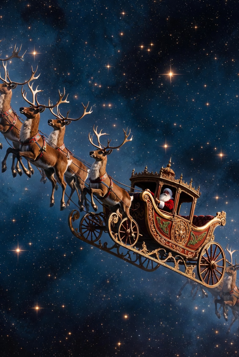 Santa travels through a starry night with his reindeer, delivering gifts from his ornate sleigh. The scene captures holiday magic and wonder.