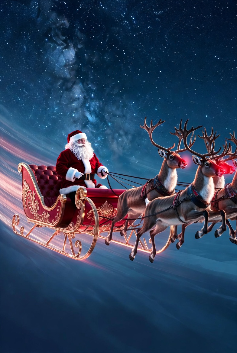Santa Claus joyfully rides through a starry night sky in his magical sleigh, pulled by energetic reindeer celebrating the holiday spirit.