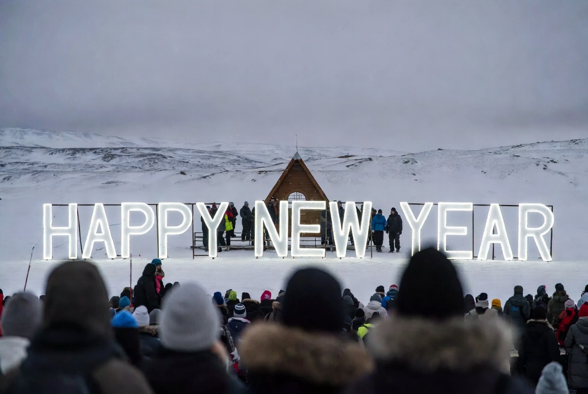 Crowds gather in a snowy landscape to celebrate the New Year. Bright lights spell out 'Happy New Year' above a cozy cabin.