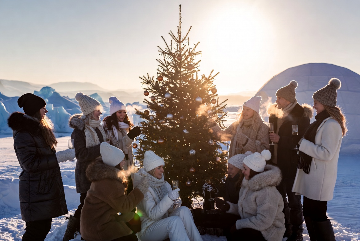 A group of friends joyfully gathers around a decorated Christmas tree, enjoying a winter celebration in a snowy landscape under bright sunlight.