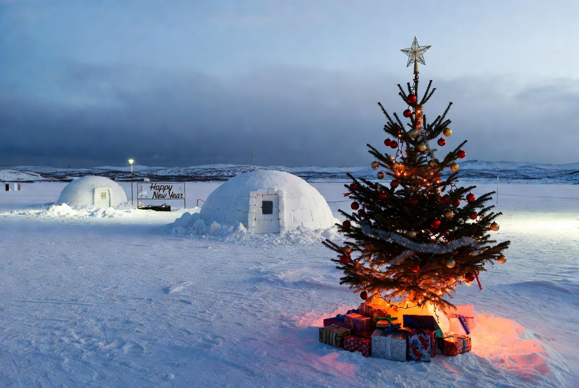 Two igloos stand on a snowy landscape, with a decorated Christmas tree surrounded by gifts glowing softly as evening falls.