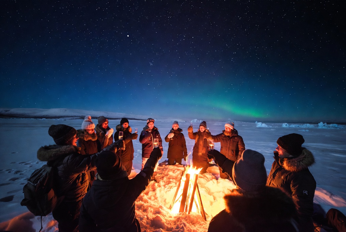activity, celebration, cold, cozy, drinks, fire, friends, fun, gathering, group, landscape, laughter, night, northern lights, outdoors, people, snow, stars, warmth, winter