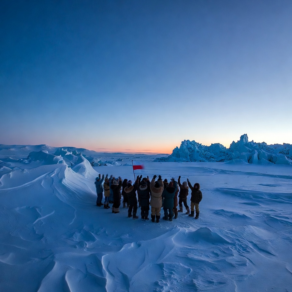 A group of people stands on snow, raising their arms in joy. The scene is set during twilight, with icy formations in the background.