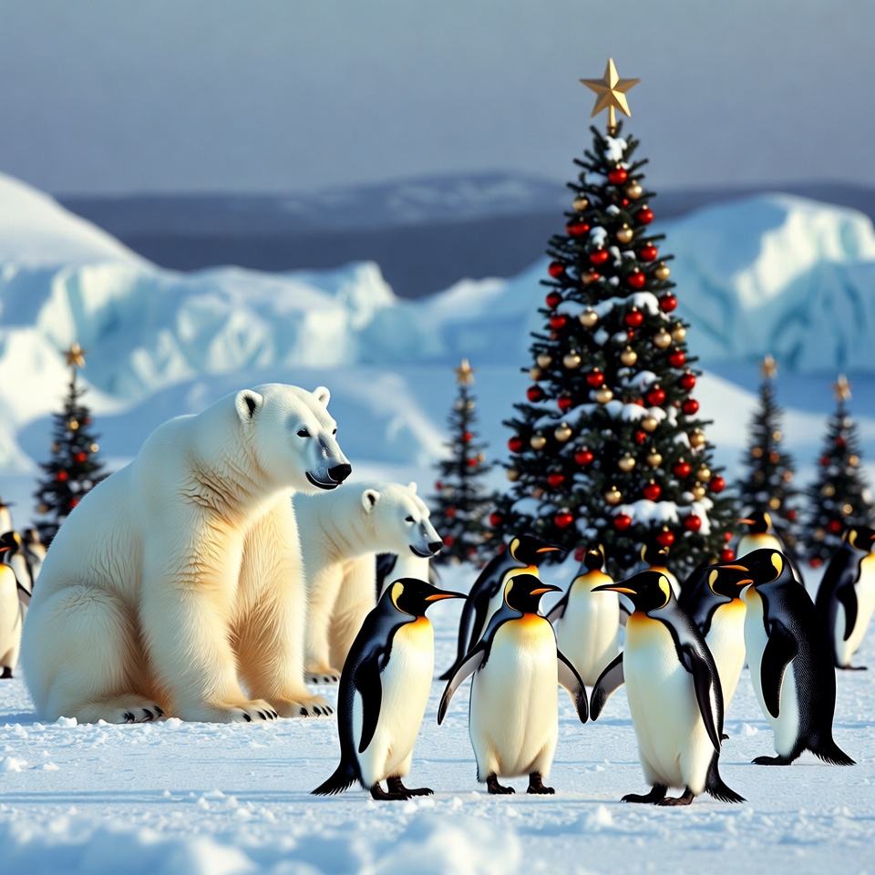 Antarctic, Arctic, Christmas, animals, celebration, cold, environment, festive, frosty, holiday, landscape, nature, penguins, playful, polar bear, scene, snow, trees, wildlife, winter