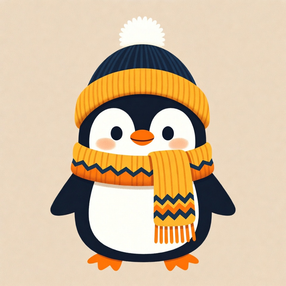 A cheerful penguin dressed in a cozy hat and scarf enjoys a playful winter look against a light background, radiating warmth and joy.