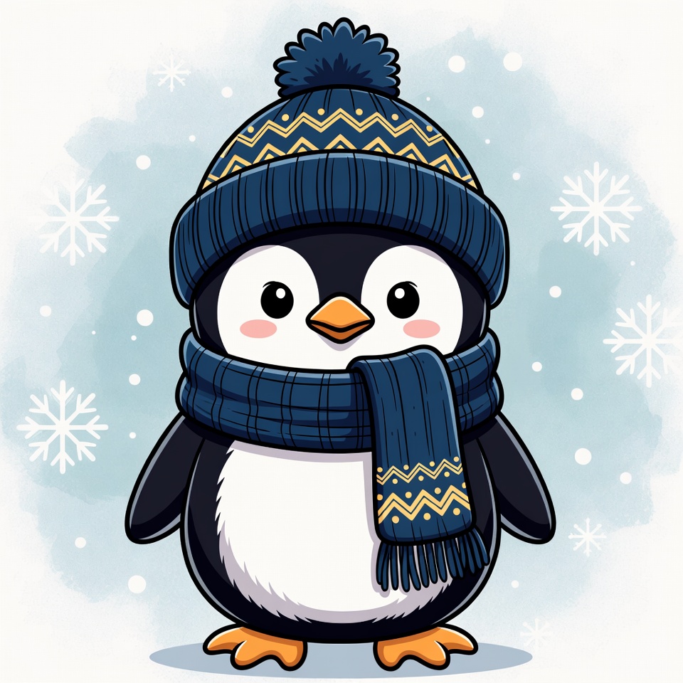 A cute penguin wearing a blue hat and scarf stands in a snowy environment, celebrating the winter season with joy and charm.