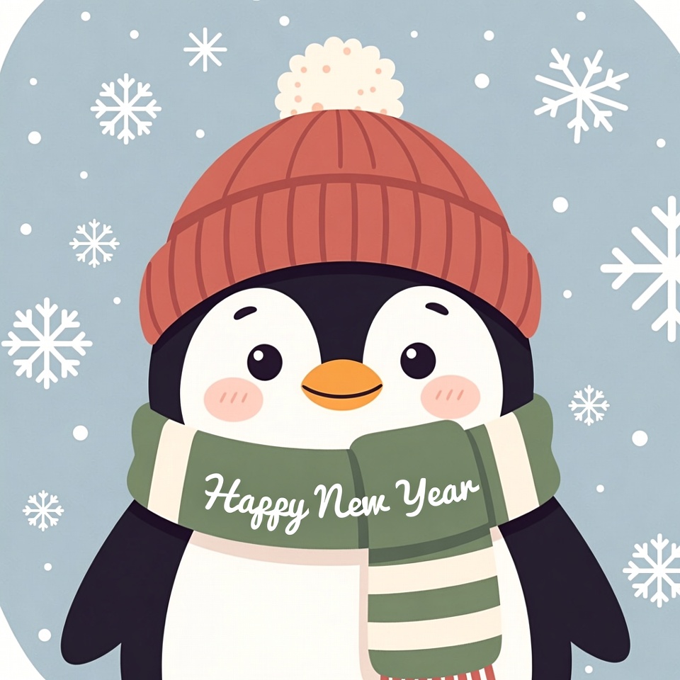 A cheerful penguin wearing a hat and scarf wishes everyone a happy New Year with snowflakes falling in the background.