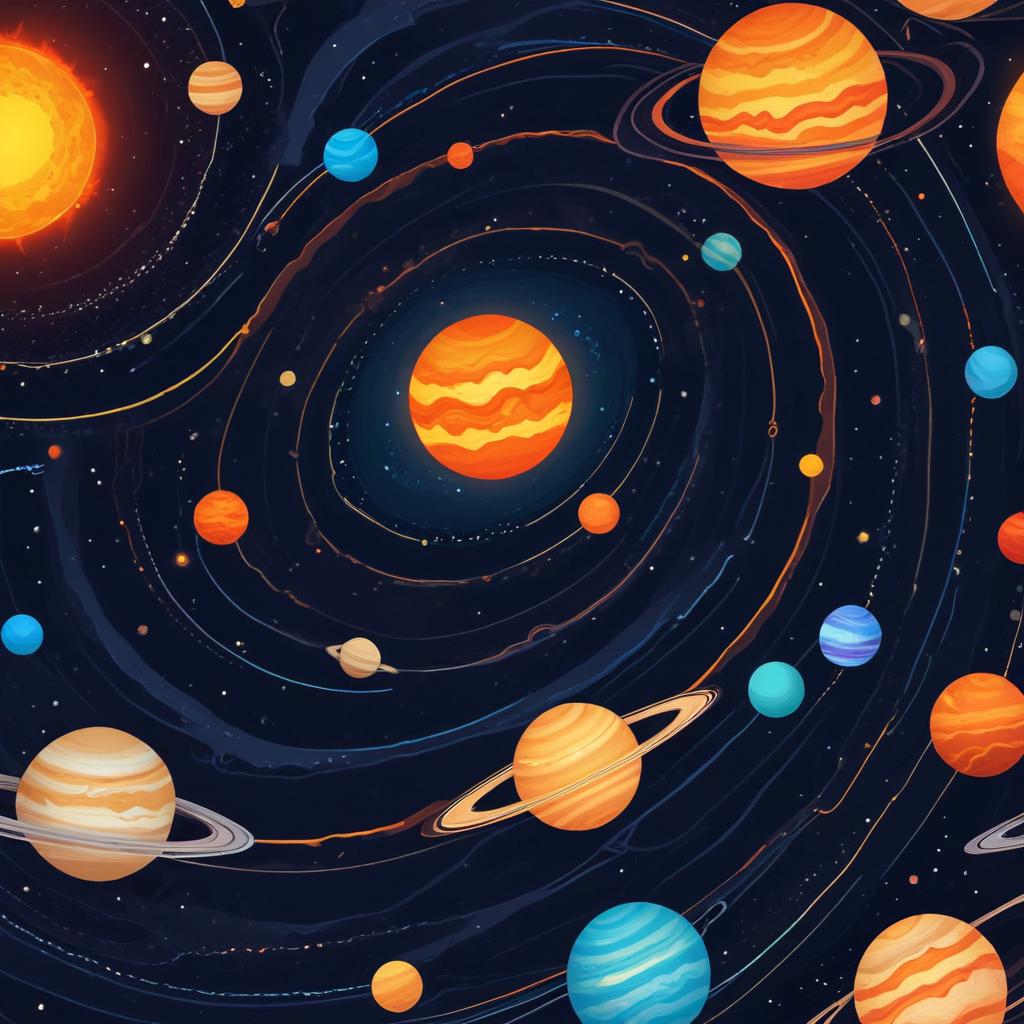 art, astronomy, blue, celestial, colorful, cosmos, distant worlds, gas giants, illustration, night, orange, orbits, planets, rings, solar system, space, stars, swirling, universe, yellow