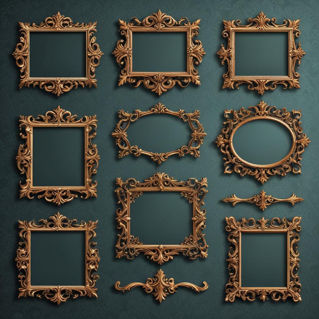 antique frames, art display, classic style, decorative frames, detailed craftsmanship, elegant design, embellishments, frame collection, frame styles, gallery decor, gold decor, home decor, interior design, luxury decor, ornate detailing, ornate frames, surface textures, unique frames, vintage design, wall art