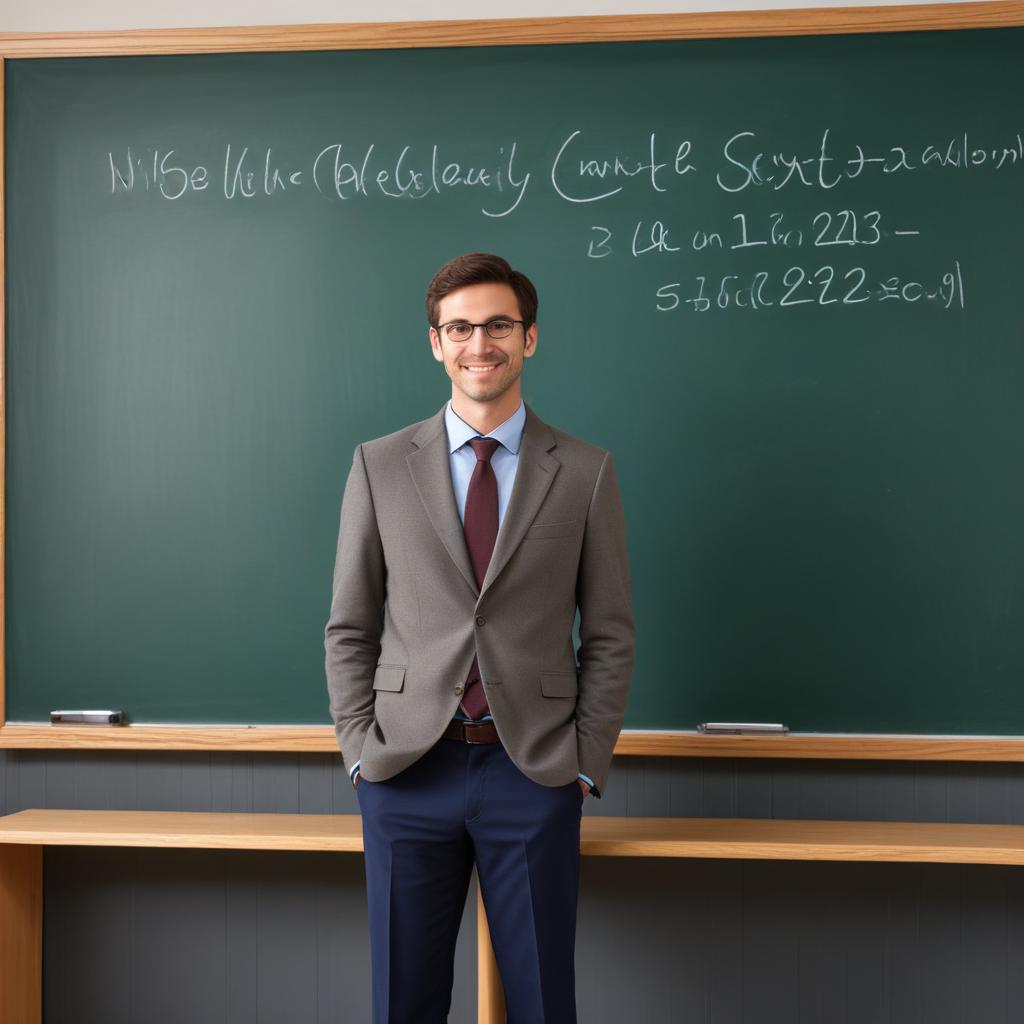 A confident teacher smiles in a bright, modern classroom, standing in front of a chalkboard filled with math equations.