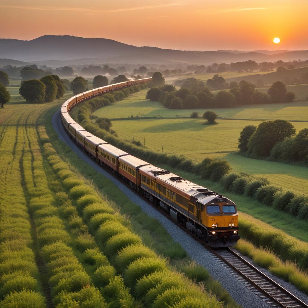 agriculture, beauty, countryside, evening light, explore, green fields, hills, journey, landscape, locomotive, nature, outdoor, railways, scenic, scenic view, sunset, tracks, train, transportation, travel