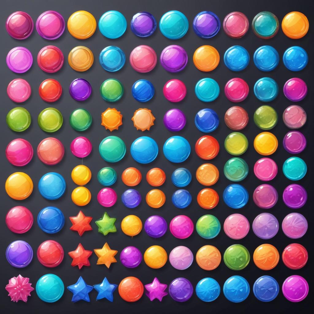 Bright and vibrant game tokens are arranged neatly on a black surface, featuring various shapes and colors. They create a cheerful display.