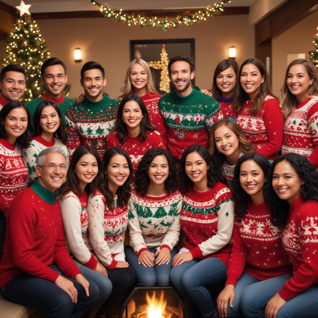 Friends gather joyfully by a warm fire, wearing colorful holiday sweaters. Christmas decorations create a cheerful atmosphere in the cozy room.