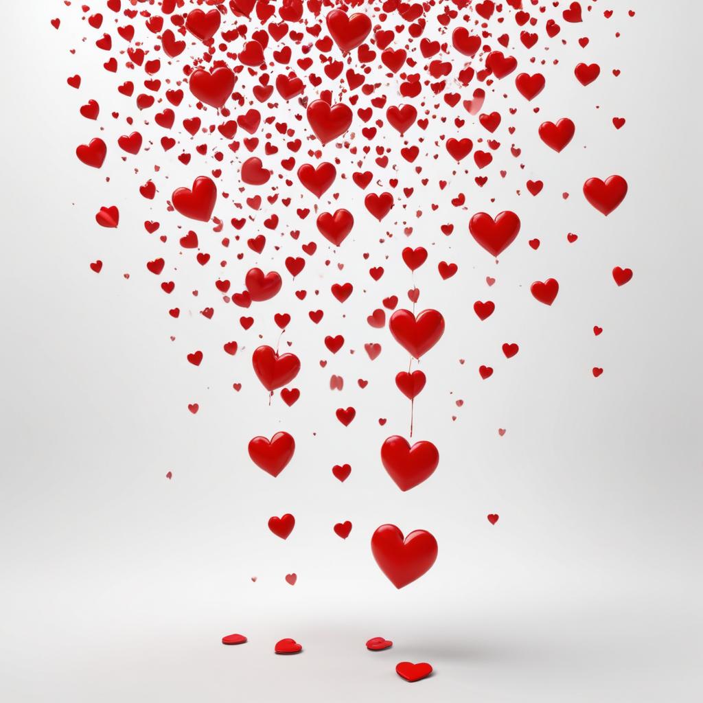 Numerous red heart shapes cascade from the top down, creating a playful and romantic atmosphere. The background is simple and white.