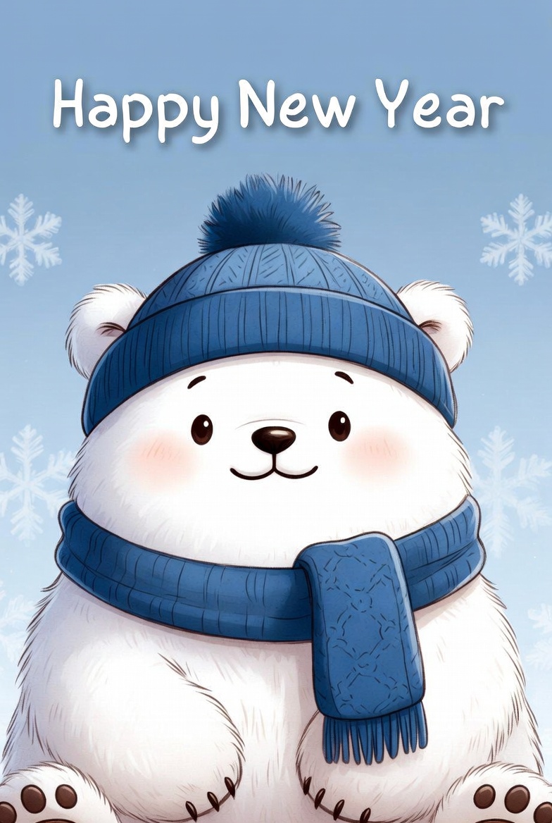 A cheerful bear wearing a blue hat and scarf wishes everyone a happy new year against a snowy background with snowflakes.