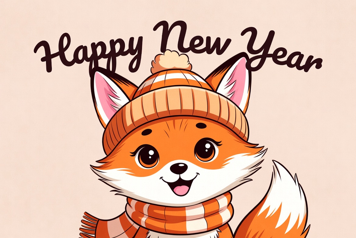 A cheerful fox wearing a knitted hat and scarf wishes everyone a happy New Year. The fox has bright eyes and a friendly smile, exuding joy.